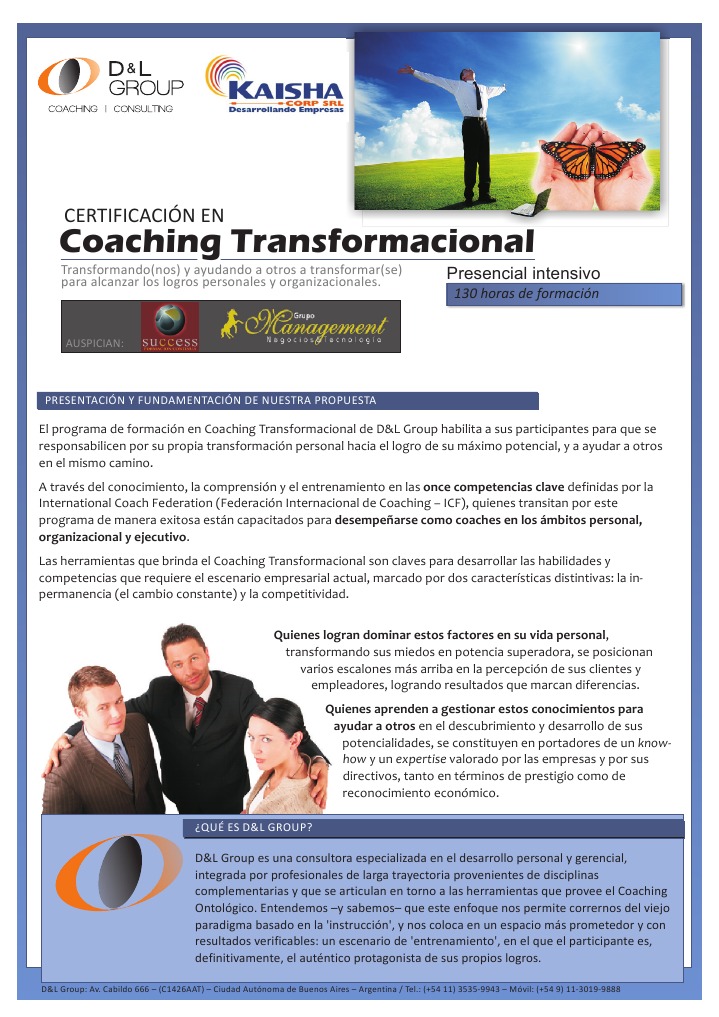 El programa de formacin en Coaching Transformacional de D&L Group habilita a sus participantes para que se responsabilicen por su propia transformacin personal hacia el logro de su mximo potencial, y a ayudar a otros en el mismo camino. A travs del conocimiento, la comprensin y el entrenamiento en las once competencias clave definidas por la International Coach Federation (Federacin Internacional de Coaching ICF), quienes transitan por este programa de manera exitosa estn capacitados para desempearse como coaches en los mbitos personal, organizacional y ejecutivo. Las herramientas que brinda el Coaching Transformacional son claves para desarrollar las habilidades y competencias que requiere el escenario empresarial actual, marcado por dos caractersticas distintivas: la inpermanencia (el cambio constante) y la competitividad. Quienes logran dominar estos factores en su vida personal, transformando sus miedos en potencia superadora, se posicionan varios escalones ms arriba en la percepcin de sus clientes y empleadores, logrando resultados que marcan diferencias. Quienes aprenden a gestionar estos conocimientos para ayudar a otros en el descubrimiento y desarrollo de sus potencialidades, se constituyen en portadores de un knowhow y un expertise valorado por las empresas y por sus directivos, tanto en trminos de prestigio como de reconocimiento econmico.