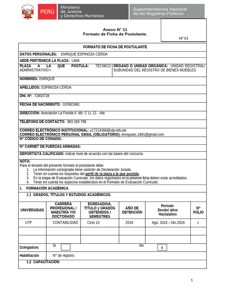 PLAZA A LA QUE POSTULA: TÉCNICO ÓRGANO O UNIDAD ORGÁNICA: UNIDAD REGISTRAL/