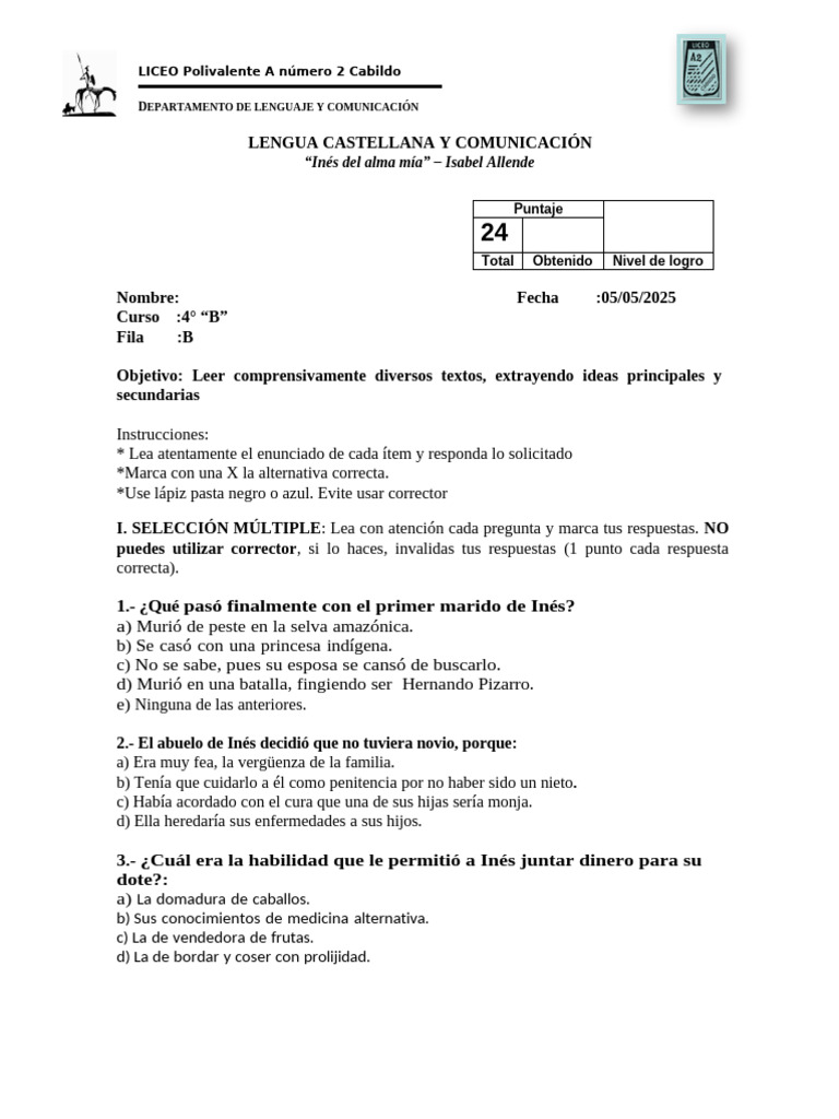 I. SELECCIÓN MÚLTIPLE: Lea con atención cada pregunta y marca tus respuestas. NO