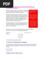 Como todos los coeficientes de la fila de la funcin objetivo son positivos, hemos llegado a la solucin ptima. Los solucin ptima viene dada por el valor de Z en la columna de los valores solucin, en nuestro caso: 33. En la misma columna se puede observar el vrtice donde se alcanza, observando las filas correspondientes a las variables de decisin que han entrado en la base: D(3,12) * Si en el problema de maximizar apareciesen como restricciones inecuaciones de la forma: ax + by c; multiplicndolas por - 1 se transforman en inecuaciones de la forma - ax - by - c y estamos en el caso anterior * Si en lugar de maximizar se trata de un problema de minimizar se sigue el mismo proceso, pero cambiando el sentido del criterio, es decir, para entrar en la base se elige la variable cuyo valor, en la fila de la funcin objetivo, sea el mayor de los positivos y se finalizan las iteraciones cuando todos los coeficientes de la fila de la funcin objetivo son negativos