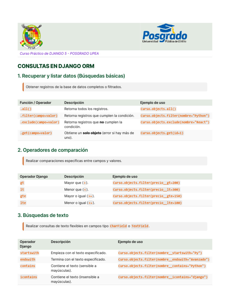 .order_by('campo') Orden ascendente por campo. Curso.objects.order_by('precio')