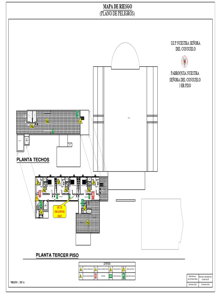 El documento presenta un plano arquitectónico que incluye diversas áreas como estudios, dormitorios, baños y terrazas. También se menciona la ubicación de un ascensor y extintores, así como la información de elaboración y aprobación. La fecha de elaboración y revisión es diciembre de 2016.