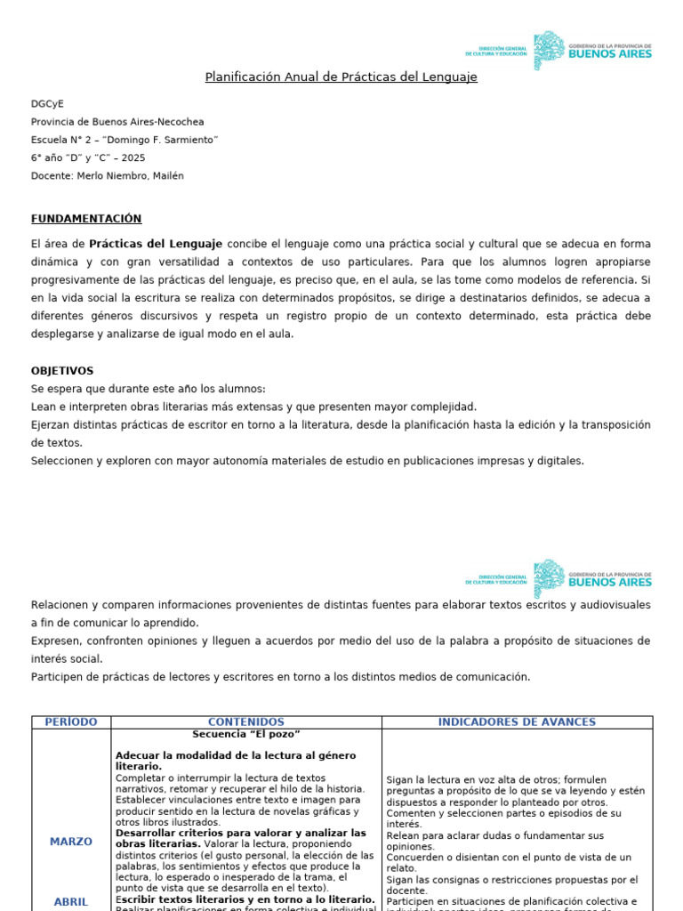 Planificación Anual de Prácticas del Lenguaje