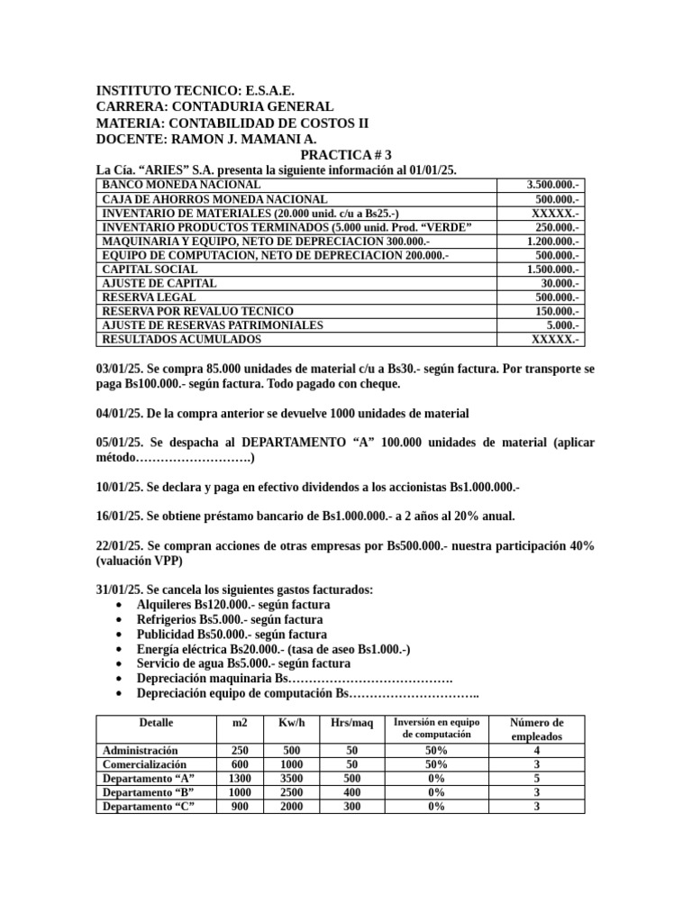 La Cía. “ARIES” S.A. presenta la siguiente información al 01/01/25.