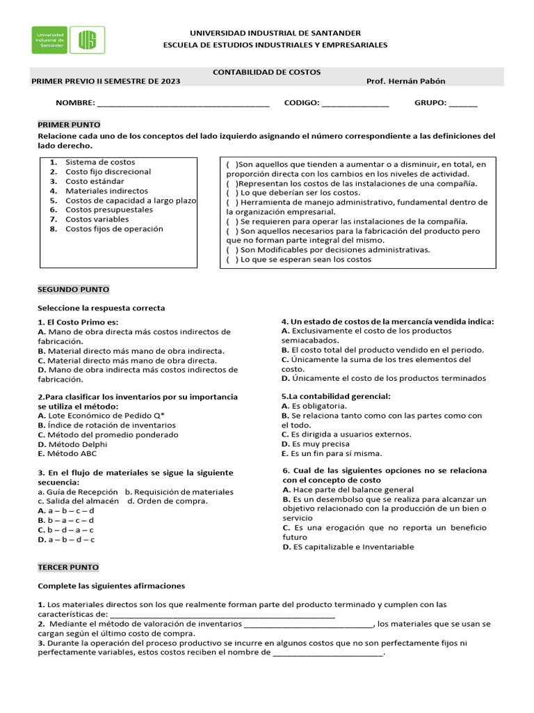 PRIMER PREVIO II SEMESTRE DE 2023 Prof. Hernán Pabón