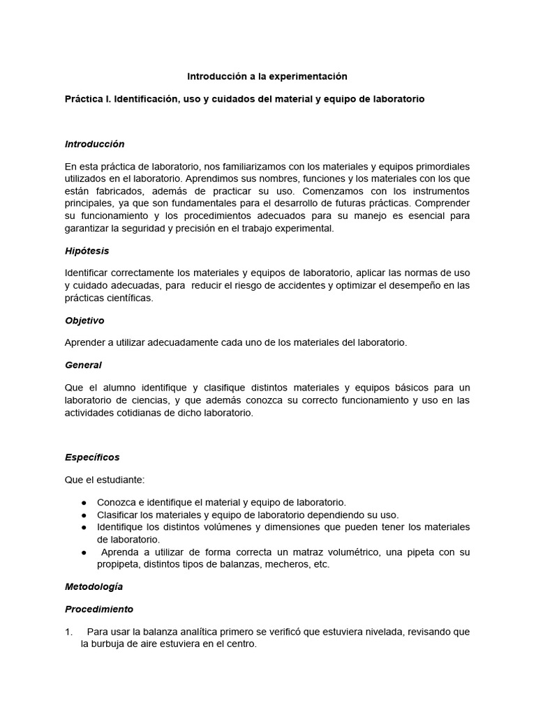 Práctica I. Identificación, uso y cuidados del material y equipo de laboratorio