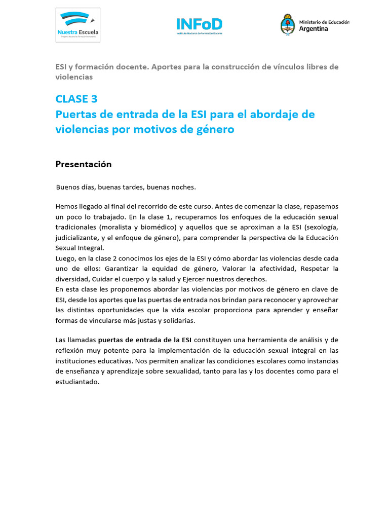 INFD (2022). Clase 3: Puertas de entrada de la ESI y violencias por motivo de género. ESI