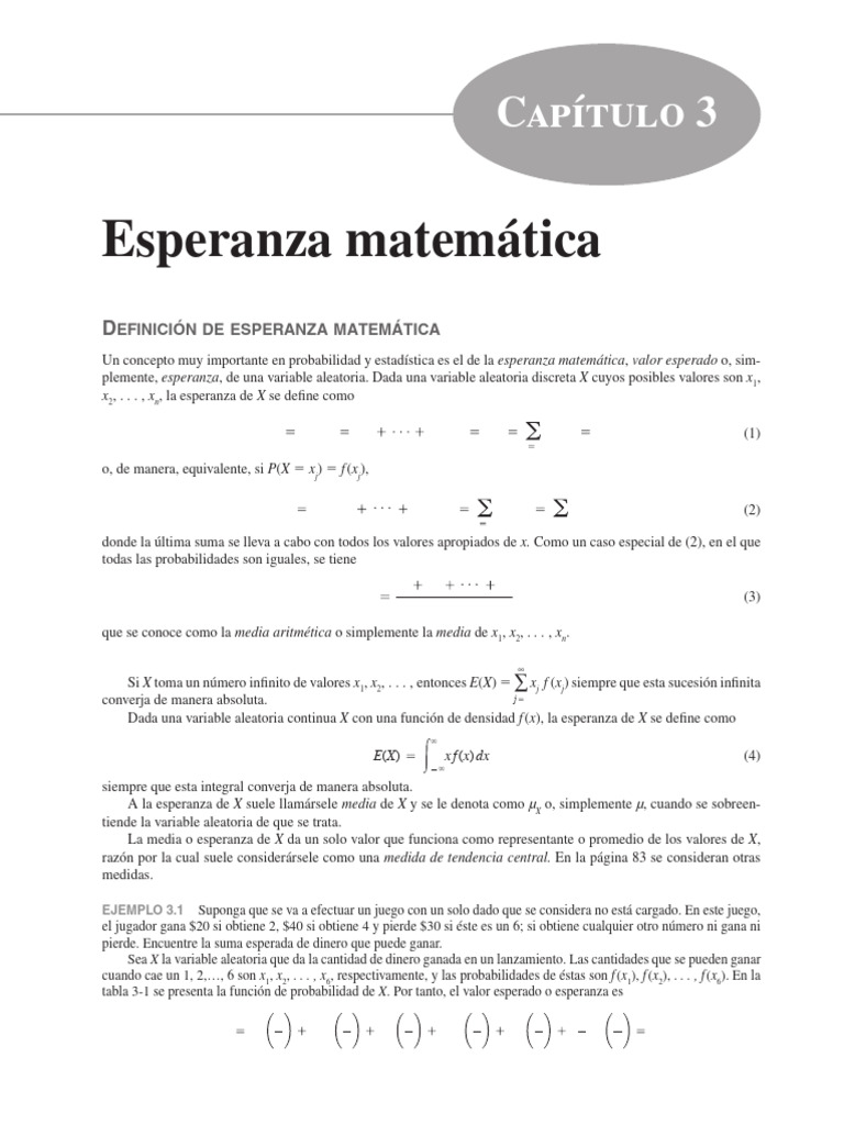 Un concepto muy importante en probabilidad y estadística es el de la esperanza matemática, valor esperado o, sim-