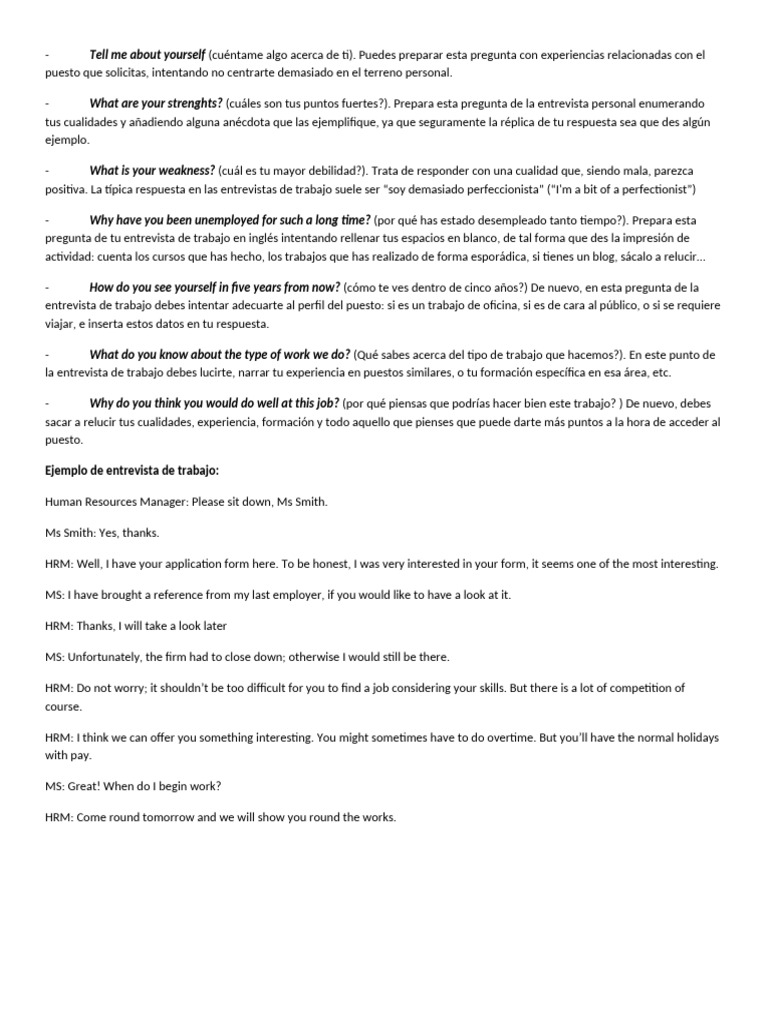 - What are your strenghts? (cuáles son tus puntos fuertes?). Prepara esta pregunta de la entrevista personal enumerando