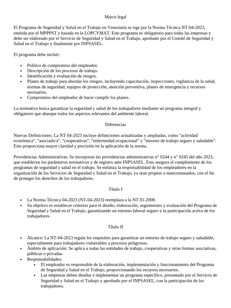 El Programa de Seguridad y Salud en el Trabajo en Venezuela se rige por la Norma Técnica NT-04-2023,