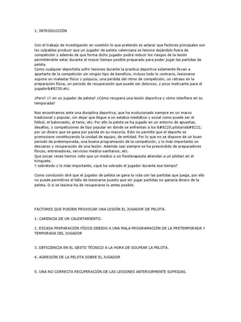 Con el trabajo de investigacin en cuestin lo que pretendo es aclarar que factores principales son los culpables producir que un jugador de pelota valenciana se lesione dejndolo fuera de competicin y adems de que forma dicho jugador podr reducir los riesgos de la lesin permitindole estar durante el mayor tiempo posible preparado para poder jugar las partidas de pelota. Como cualquier deportista sufrir lesiones durante la practica deportiva solamente llevan a apartarte de la competicin sin ningn tipo de beneficio, incluso todo lo contrario, lesionarse supone un malestar fsico y psquico, una perdida del ritmo de competicin, un retraso en la preparacin fsica, un periodo de recuperacin que puede ser doloroso, y poco motivante para el jugador…etc. Pero? Y en un jugador de pelota? Cmo recupera una lesin deportiva y cmo interfiere en su temporada? Nos encontramos ante una disciplina deportiva, que ha evolucionado siempre en un marco tradicional y popular, sin dejar que llegue a un estatus meditico y social como puede ser el ftbol, el baloncesto, el tenis, etc. Por ello la pelota se ha jugado en un entorno de apuestas, desafos, y competiciones de tipo popular en donde se enfrentan a los “pilotaris” por un dinero que se gana por parida en su mayora. Esto no permite que el deporte se promocione constituyendo la unidad de equipo, de entidad. Por lo que no se dispone de un buen periodo de pretemporada, una buena programacin de la competicin, y lo ms importante un descanso y recuperacin de una lesin. Adems casi siempre se ha prescindido de preparadores fsicos, entrenadores, servicios medico-sanitarios, etc. Que pocas veces hemos visto que un medico o un fisioterapeuta atiendan a un pilotari en el trinquete. Y sobretodo y lo ms importante, qu ha cobrado el jugador durante ese tiempo? Como conclusin dir que el jugador de pelota se gana la vida con las partidas que juega, por ello no puede permitirse el fallo de lesionarse puesto que sin jugar partidas no ganara dinero de la pelota. O si se lesiona ha de recuperarse lo antes posible.