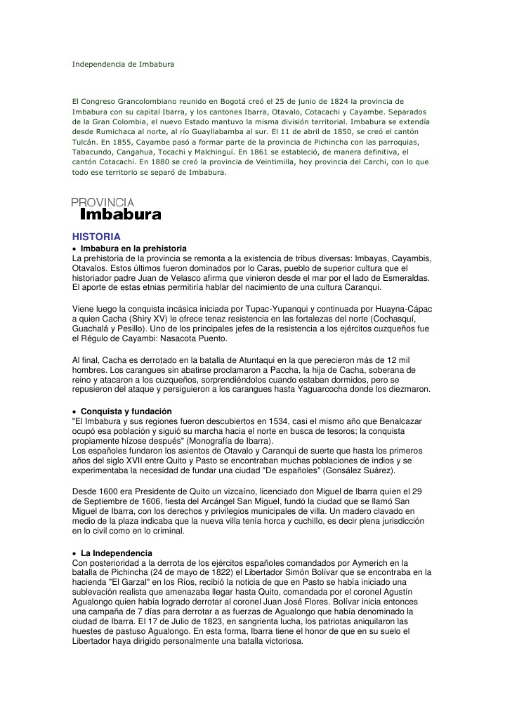 Imbabura en la prehistoria La prehistoria de la provincia se remonta a la existencia de tribus diversas: Imbayas, Cayambis, Otavalos. Estos ltimos fueron dominados por lo Caras, pueblo de superior cultura que el historiador padre Juan de Velasco afirma que vinieron desde el mar por el lado de Esmeraldas. El aporte de estas etnias permitira hablar del nacimiento de una cultura Caranqui. Viene luego la conquista incsica iniciada por Tupac-Yupanqui y continuada por Huayna-Cpac a quien Cacha (Shiry XV) le ofrece tenaz resistencia en las fortalezas del norte (Cochasqu, Guachal y Pesillo). Uno de los principales jefes de la resistencia a los ejrcitos cuzqueos fue el Rgulo de Cayambi: Nasacota Puento. Al final, Cacha es derrotado en la batalla de Atuntaqui en la que perecieron ms de 12 mil hombres. Los carangues sin abatirse proclamaron a Paccha, la hija de Cacha, soberana de reino y atacaron a los cuzqueos, sorprendindolos cuando estaban dormidos, pero se repusieron del ataque y persiguieron a los carangues hasta Yaguarcocha donde los diezmaron. Conquista y fundacin "El Imbabura y sus regiones fueron descubiertos en 1534, casi el mismo ao que Benalcazar ocup esa poblacin y sigui su marcha hacia el norte en busca de tesoros; la conquista propiamente hzose despus" (Monografa de Ibarra). Los espaoles fundaron los asientos de Otavalo y Caranqui de suerte que hasta los primeros aos del siglo XVII entre Quito y Pasto se encontraban muchas poblaciones de indios y se experimentaba la necesidad de fundar una ciudad "De espaoles" (Gonslez Surez). Desde 1600 era Presidente de Quito un vizcano, licenciado don Miguel de Ibarra quien el 29 de Septiembre de 1606, fiesta del Arcngel San Miguel, fund la ciudad que se llam San Miguel de Ibarra, con los derechos y privilegios municipales de villa. Un madero clavado en medio de la plaza indicaba que la nueva villa tena horca y cuchillo, es decir plena jurisdiccin en lo civil como en lo criminal. La Independencia Con posterioridad a la derrota de los ejrcitos espaoles comandados por Aymerich en la batalla de Pichincha (24 de mayo de 1822) el Libertador Simn Bolvar que se encontraba en la hacienda "El Garzal" en los Ros, recibi la noticia de que en Pasto se haba iniciado una sublevacin realista que amenazaba llegar hasta Quito, comandada por el coronel Agustn Agualongo quien haba logrado derrotar al coronel Juan Jos Flores. Bolvar inicia entonces una campaa de 7 das para derrotar a as fuerzas de Agualongo que haba denominado la ciudad de Ibarra. El 17 de Julio de 1823, en sangrienta lucha, los patriotas aniquilaron las huestes de pastuso Agualongo. En esta forma, Ibarra tiene el honor de que en su suelo el Libertador haya dirigido personalmente una batalla victoriosa.