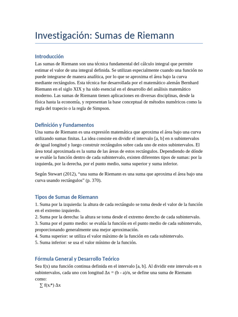 Según Stewart (2012), “una suma de Riemann es una suma que aproxima el área bajo una