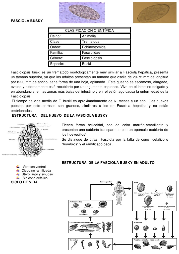 LOCALIZACIN La Fasciola buski es un trematodo que en forma adulta presenta un tamao de 20-75 mm de longitud por 8-20 mm de ancho Los adultos producen ms de 25.000 huevos cada da que toman hasta siete semanas para madurar LOS MEDIOS POR LOS CUALES EL PARSITO ABANDONA EL HUSPED Por medio de los huevos, en el momento de la puesta, son inmaduros y, por tanto, al salir con las heces necesitan el contacto con agua dulce durante 3-7 semanas eclosionan en 27-32 C ESTADIO INFECTANTE El agua debe estar en reposo, por tanto son preferibles para su desarrollo las aguas estancadas y con temperatura clida, ya que as se favorece el desarrollo del embrin. Pasado este tiempo, se liberan los miracidios que van a nadar por el agua hasta que entran en contacto con caracoles de la familia Planorbidae, donde sufren 3 etapas de desarrollo ( esporocistos, redias y cercarias) transcurridas unas cuantas semanas, se liberan las cercarias de los caracoles y se enquistan como metacercarias en las plantas acuticas como la castaa de agua, el abrojo de agua, las races del bamb de agua, las batatas, o los berros. Cada planta acutica puede contener hasta 200 metacercarias. LOS MEDIOS POR LOS CUALES SE INFESTA UN NUEVO HUSPED El hombre se infesta al ingerir las metacercarias enquistadas en las plantas y al llegar al duodeno o al yeyuno se desenquistan y, despus de aproximadamente 3 meses, se transforman en adultos los cuales se desarrollan en el intestino delgado Estos adultos se fijan mayoritariamente en el duodeno y yeyuno, originando una ulceracin en la mucosa y rotura de los capilares Los adultos tienen una vida til de aproximadamente un ao. MTODO DE DIAGNSTICO Descubrimiento e identificacin de huevecillos caractersticos en heces fecales