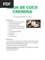HORCHATA DE COCO Ingredientes: La base de la Horchata Vainilla 1 lata de crema de coco Modo de preparacin: El agua de un coco y la pulpa la licuas con el mismo liquido y la cuelas y para hacerla de pia colada solo agrega un litro de jugo de pia.