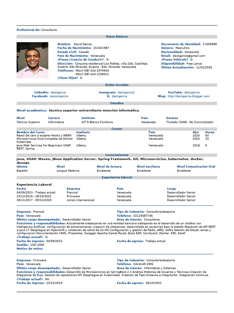 Último cargo desempeñado: Desarrollador Senior Área de interés: Consultoría
