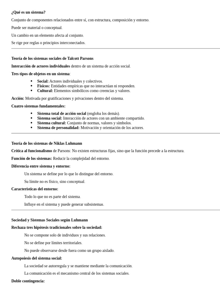 Parsons: Ve los sistemas como interacciones estructuradas entre actores con cultura, valores y motivaciones.