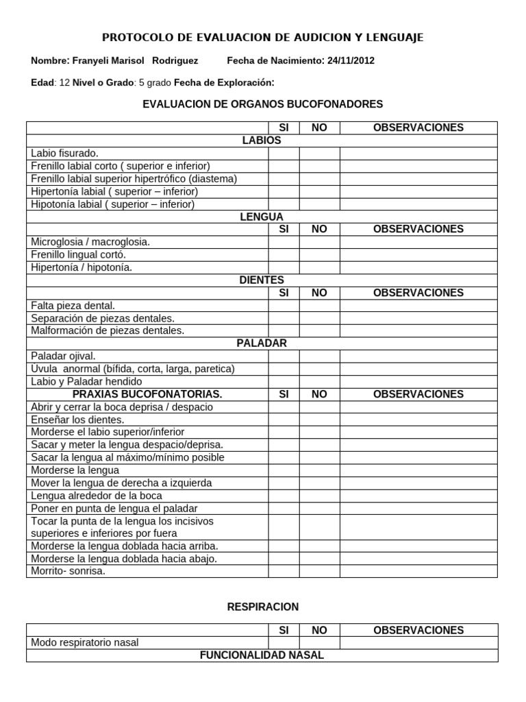 PROTOCOLO DE EVALUACION DE AUDICION Y LENGUAJE