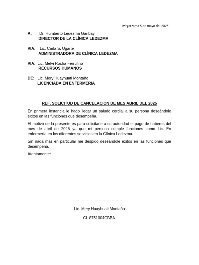 REF. SOLICITUD DE CANCELACION DE MES ABRIL DEL 2025