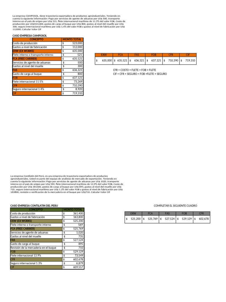 Costo de producción $ 361,400 EXW FCA FAS FOB CFR