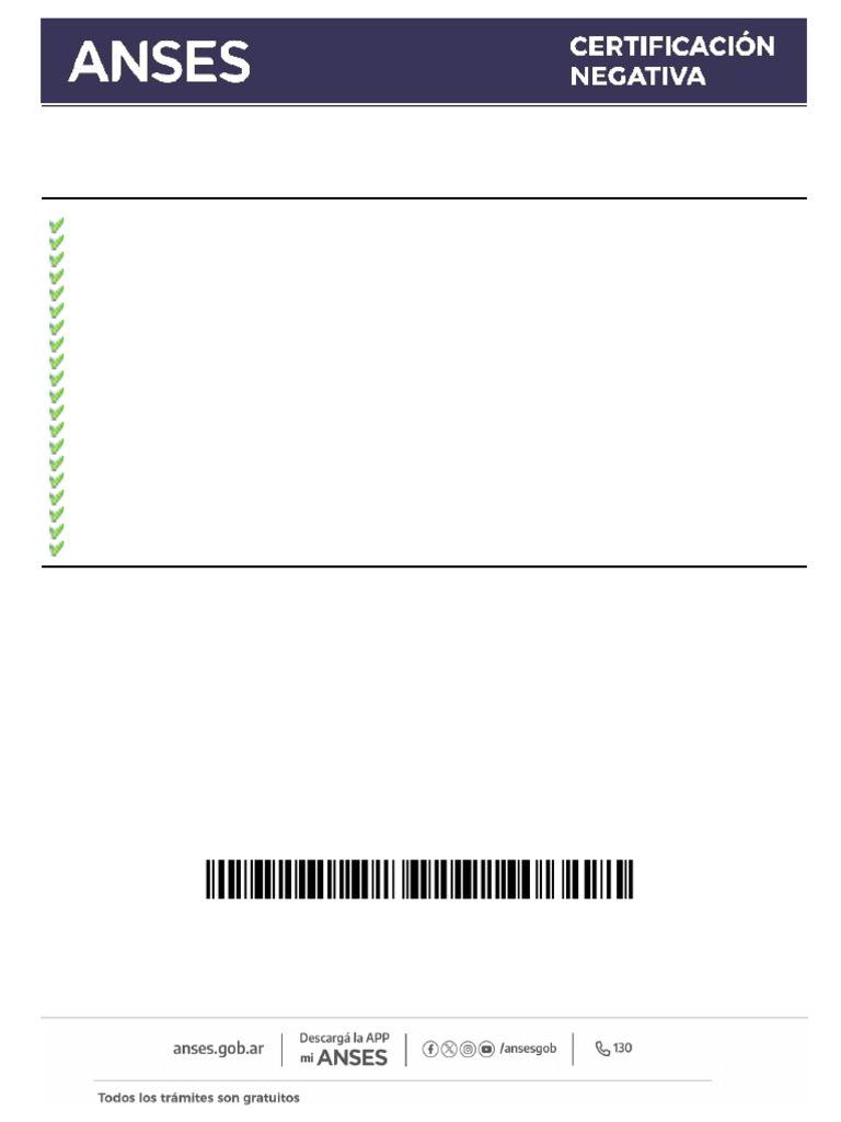 La Certificación Negativa emitida aquí no requiere la autenticación con sello y firma de un agente de ANSES (Art. 1º de la Resolución D.E. Nº 76/09)