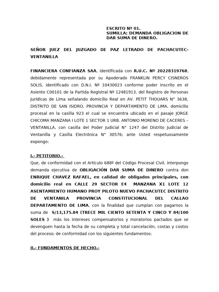 SEÑOR JUEZ DEL JUZGADO DE PAZ LETRADO DE PACHACUTEC-