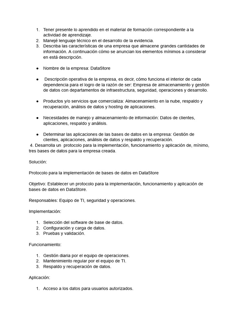 4. Desarrolla un protocolo para la implementación, funcionamiento y aplicación de, mínimo,
