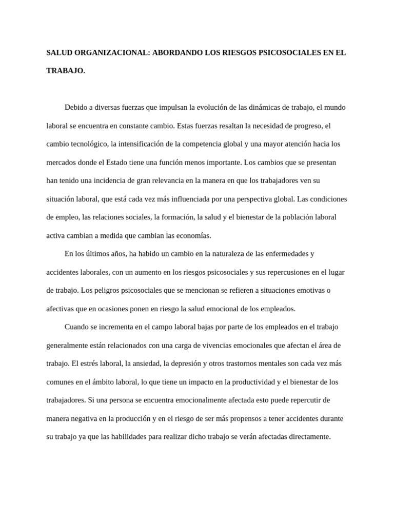 SALUD ORGANIZACIONAL: ABORDANDO LOS RIESGOS PSICOSOCIALES EN EL