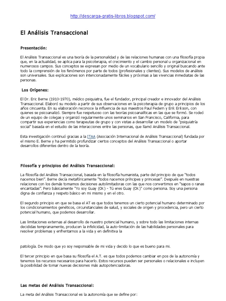 Presentacin: El Anlisis Transaccional es una teora de la personalidad y de las relaciones humanas con una filosofa propia que, en la actualidad, se aplica para la psicoterapia, el crecimiento y el cambio personal u organizacional en numerosos campos. Sus conceptos se expresan por medio de un vocabulario sencillo y original buscando ante todo la comprensin de los fenmenos por parte de todos (profesionales y clientes). Sus modelos de anlisis son universales. Sus explicaciones son intencionadamente fciles y prximas a las vivencias inmediatas de las personas. Los Orgenes: El Dr. Eric Berne (1910-1970), mdico psiquiatra, fue el fundador, principal creador e innovador del Anlisis Transaccional. Elabor su modelo a partir de sus observaciones en la psicoterapia de grupo a principios de los aos cincuenta. En su elaboracin reconoce la influencia de sus maestros Paul Federn y Erik Erikson, con quienes se psicoanaliz. Siempre fue respetuoso con las teoras psicoanalticas en las que se form. Se rode de un equipo de colegas y organiz regularmente unos seminarios en San Francisco, California, para compartir sus experiencias como terapeutas de grupo y con vistas a desarrollar un modelo de "psiquiatra social" basada en el estudio de las interacciones entre las personas, que llam Anlisis Transaccional. Esta investigacin continu gracias a la ITAA (Asociacin Internacional de Anlisis Transaccional) fundada por el mismo E. Berne y ha permitido profundizar ciertos conceptos del Anlisis Transaccional o aportar desarrollos diferentes dentro de la teora.