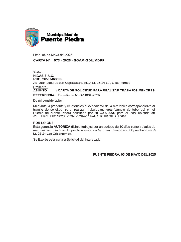 ASUNTO : CARTA DE SOLICITUD PARA REALIZAR TRABAJOS MENORES