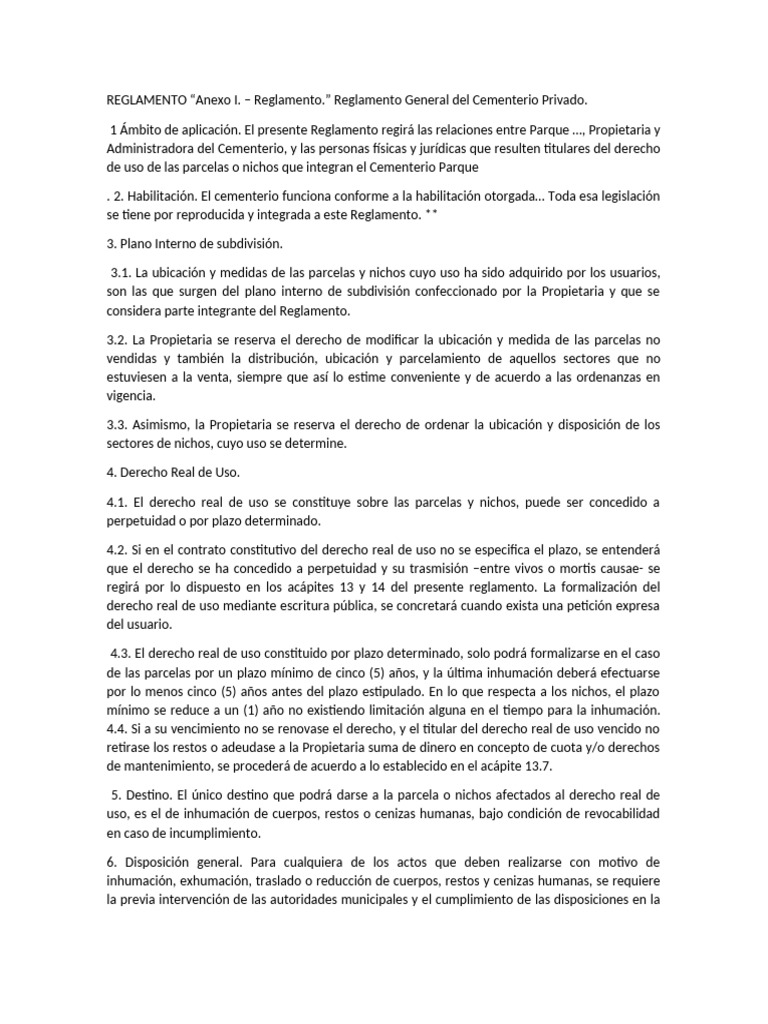 REGLAMENTO “Anexo I. – Reglamento.” Reglamento General del Cementerio Privado.
