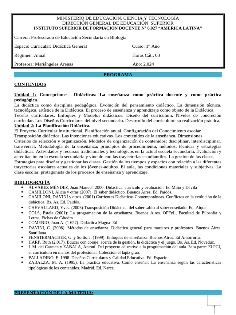 Espacio Curricular: Didáctica General Curso: 1° Año
