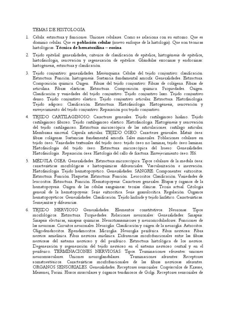 Que es poblacin celular (nuevo enfoque de la histologa). Que son tcnicas histolgicas. Tcnica de hematoxilina eosina. 2. Tejido epitelial: generalidades, criterios de clasificacin de epitelios, histognesis de epitelios, histofisiologia, renovacin y regeneracin de epitelios. Glndulas exocrinas y endocrinas: histognesis, estructura y clasificacin. 3. Tejido conjuntivo: generalidades. Mesnquima. Clulas del tejido conjuntivo: clasificacin. Estructura. Funcin. histogenesis. Sustancia fundamental amorfa: Generalidades. Estructura. Composicin qumica. Origen. Fibras del tejido conjuntivo: Fibras de colgena. Fibras de reticulina. Fibras elsticas. Estructura. Composicin qumica. Propiedades. Origen. Clasificacin y variedades del tejido conjuntivo: Tejido conjuntivo laxo. Tejido conjuntivo denso. Tejido conjuntivo elstico. Tejido conjuntivo reticular. Estructura. Histofisiologa. Tejido adiposo: Clasificacin. Estructura. Histofisiologa. Histognesis, renovacin y envejecimiento del tejido conjuntivo: Reparacin por tejido conjuntivo. 4. TEJIDO CARTILAGINOSO: Caracteres generales. Tejido cartilaginoso hialino. Tejido cartilaginoso fibroso. Tejido cartilaginoso elstico. Histofisiologa. Histognesis y renovacin del tejido cartilaginoso. Estructura microscpica de las articulaciones. cartlago articular. Membrana sinovial. Cpsula articular. TEJIDO SEO: Caracteres generales. Matriz sea: fibras colgenas. Sustancias fundamental amorfa. Sales minerales. Poblaciones celulares en tejido seo. Variedades texturales del tejido seo: tejido seo no laminar, tejido seo laminar. Histofisiologa del tejido seo. Estructura microscpica del hueso: Generalidades. Histofisiologa. Reparacin sea: Histologa del callo de fractura. Envejecimiento seo. H6. 5. MDULA SEA: Generalidades. Estructura microscpica. Tipos celulares de la medula sea: caractersticas morfolgicas e histoqumicas diferenciales. Vascularizacin e inervacin. Histofisiologa. Tejido hematopoytico. Generalidades. SANGRE: Componentes: eritrocitos. Estructura. Funcin. Plaquetas. Estructura: Funcin. Leucocitos: Clasificacin. Variedades de leucocitos. Estructura. Funcin. Hematopoyesis: Caracteres generales. Etapas y rganos de la hematopoyesis. Origen de las clulas sanguneas: teoras clsicas. Teora actual. Citologa general de la hematopoyesis: Serie eritroctica. Serie granuloctica. Regulacin. rganos hematopoyticos: Generalidades. Clasificacin. Tejido linfoide y tejido linftico. Caractersticas. Semejanzas y diferencias. 6. TEJIDO NERVIOSO Generalidades. Elementos constitutivos. Neuronas. Tipos morfolgicos. Estructura. Propiedades. Relaciones neuronales: Generalidades: Sinapsis: Sinapsis elctricas, sinapsis qumicas. Neurotransmisores y neuromoduladores. Funciones de las neuronas. Circuitos neuronales. Neuroglia: Clasificacin y origen de la neuroglia. Astrocitos. Oligodendrocitos. Ependimocitos. Microglia. Neuroglia perifrica. Fibra nerviosa: Fibra nervios amielnica. Fibra nerviosa mielnica. Diferencias morfofuncionales entre las fibras nerviosas del sistema nervioso y del perifrico. Estructura histolgica de los nervios. Degeneracin y regeneracin del tejido nervioso en el sistema nervioso central y en el perifrico. TERMINACIONES NERVIOSAS: Tipos. Terminaciones eferentes: uniones neuromusculares. Uniones neuroglandulares. Terminaciones aferentes: Receptores somatoestsicos. Caractersticas morfofuncionales de las fibras nerviosas aferentes. ORGANOS SENSORIALES. Generalidades. Receptores sensoriales: Corpsculos de Krause, Meissner, Pacini. Husos musculares y rganos tendinosos de Golgi. Receptores sensoriales de