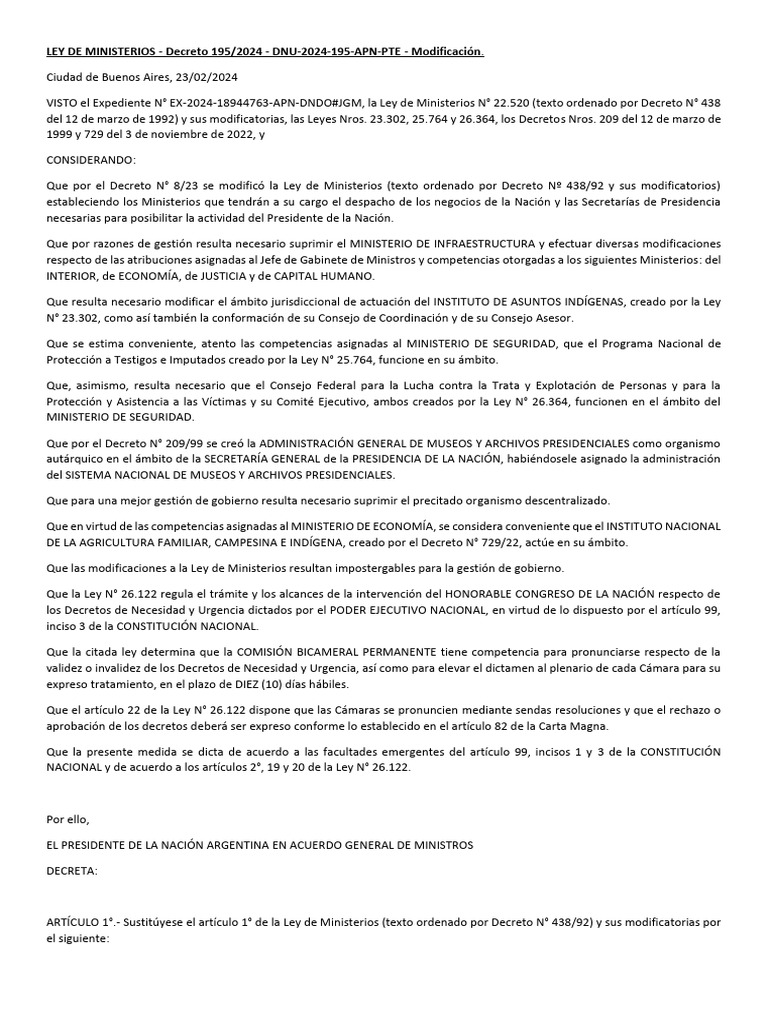 LEY DE MINISTERIOS - Decreto 195/2024 - DNU-2024-195-APN-PTE - Modificación.