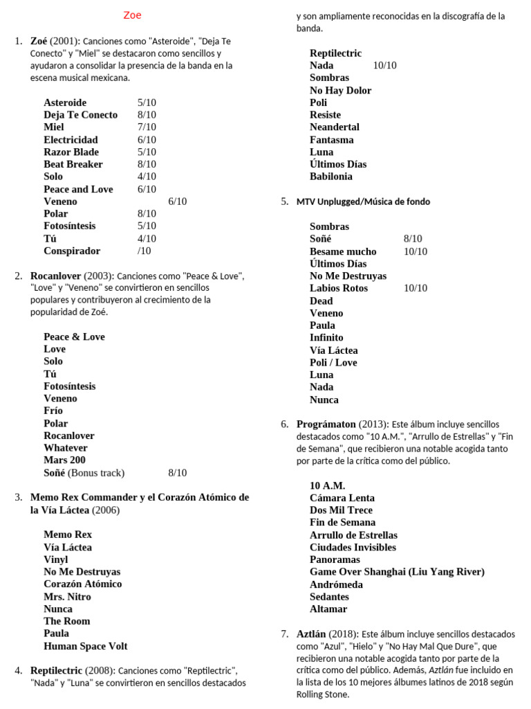 1. Zoé (2001): Canciones como "Asteroide", "Deja Te