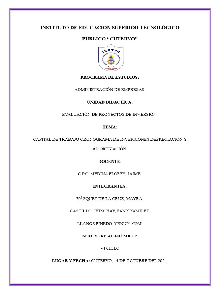 CAPITAL DE TRABAJO CRONOGRAMA DE INVERSIONES DEPRECIACIÓN Y