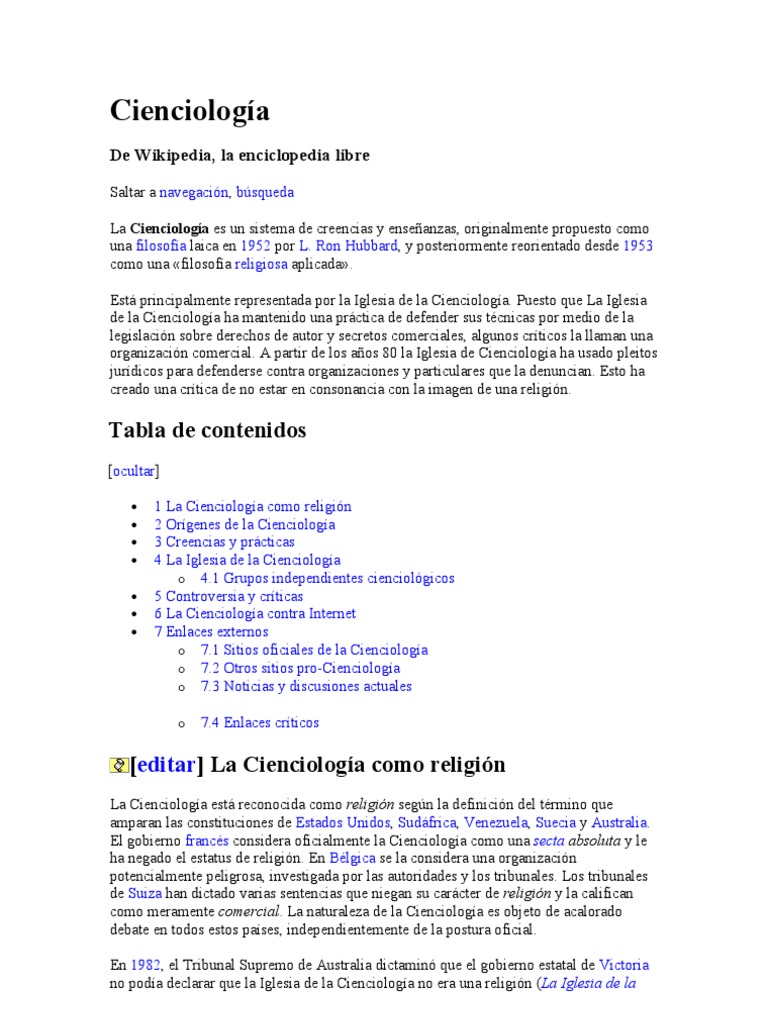 1 La Cienciologa como religin 2 Orgenes de la Cienciologa 3 Creencias y prcticas 4 La Iglesia de la Cienciologa o 4.1 Grupos independientes cienciolgicos 5 Controversia y crticas 6 La Cienciologa contra Internet 7 Enlaces externos o 7.1 Sitios oficiales de la Cienciologa o 7.2 Otros sitios pro-Cienciologa o 7.3 Noticias y discusiones actuales