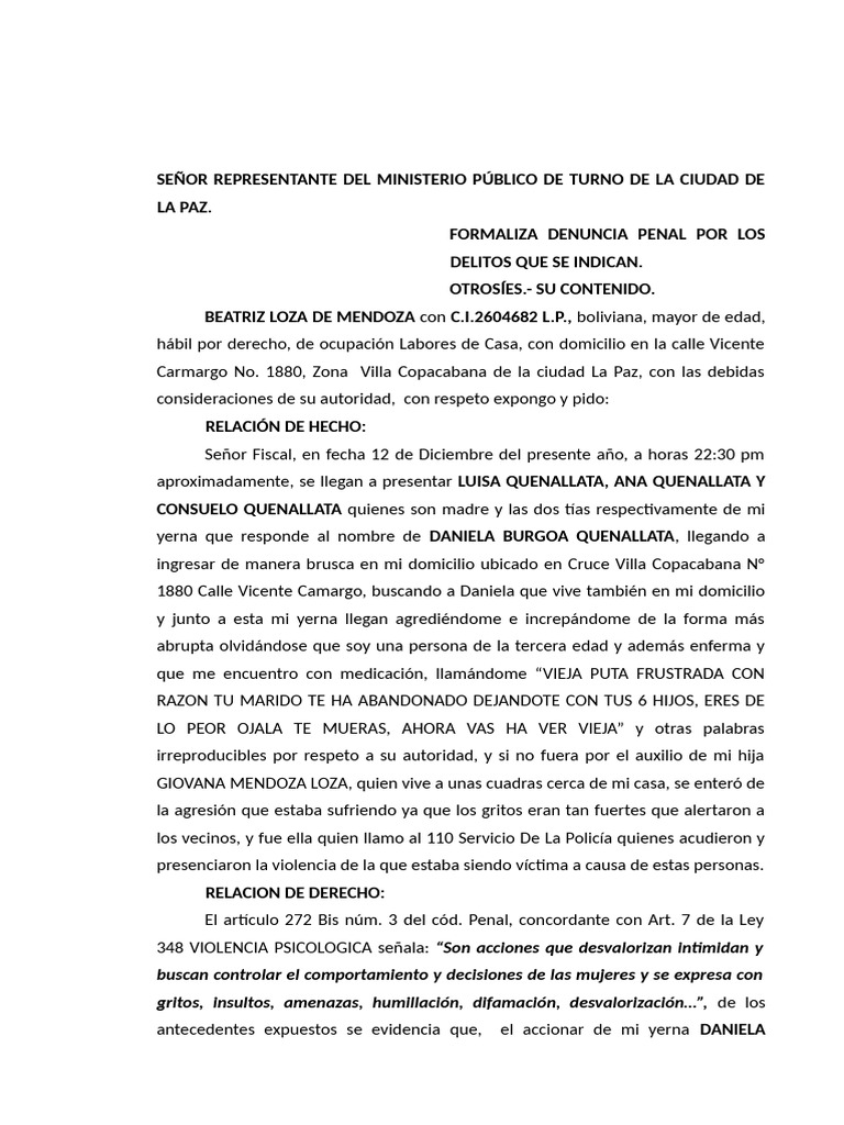 Procedimiento Penal, FORMULO DENUNCIA EN CONTRA DE DANIELA BURGOA