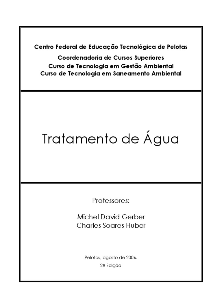 Azevedo Netto, J.M. Tcnicas de Abastecimento e Tratamento de gua. Volume 2 - Tratamento de gua. CETESB/ASCETESB. So Paulo, 1987. Barros, R. T. et allii. Manual de Saneamento e Proteo Ambiental para os Municpios. Vol. 2 Saneamento. DESA/UFMG. Belo Horizonte, 1995. Di Bernardo, L. Mtodos e Tcnicas de Tratamento de gua. Volume I e II. Abes, So Paulo, 1993. Macedo, J.A.B de. guas&guas. Ortofarma. Juiz de Fora/MG, 2000. Santos Filho. D.F. Tecnologia de Tratamento de gua. 2 edio. Livraria Nobel. So Paulo, 1984.