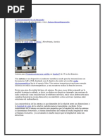 Debido a la gran atenuacin e interferencia que sufren las seales que atraviesan el espacio, o n es necesario que las antenas usadas como telescopio tengan una gran rea efectiva, siendo a adems util muchas veces la utilizacin de Arrays de antenas. a o Existen dos tcnicas utilizadas, los Radio Telescopios propiamente dichos que son simplee mente una antena parablica muy grande (algunos de hasta 300m de dimetro) los cuales se o a apuntan a diferentes regiones del cielo para captar seales provenientes de estrellas lejanas. n Por otro lado, es posible la conexin de muchas antenas, formando un Array, de manera de o generar un patrn de interferencia. Dicha conguracin equivale a una antena del tamao de o o n las antenas ms alejadas del Array. a Analizaremos el NRAO - VRA (National Radio Astronomy Observatory - Very Large Array) situado en Nuevo Mxico, USA (ver Figura 2.1) para observar las caracter e sticas que presentan las antenas del mismo. Consiste de 27 antenas independientes, cada una con un dimetro de a plato de 25m. Las mismas se encuentran distribuidas en forma de Y, con una longitud en cada brazo de 21Km. Las antenas pueden ser acomodadas para obtener una separacin mxima de o a 36Km, funcionando como una gran antena de ese tamao. De esta manera, la mayor apertura n angular que puede ser obtenida es de 0,04 arcos segundo a una longitud de onda de 7mm ( 4GHz). Para dar una idea, esto es equivalente a ver una pelota de golf a 150Km3 . Las antenas son capaces de detectar con una elevacin m o nima de 8 en un rango de frecuencias entre 74M Hz y 50GHz. Es importante tener en cuenta la velocidad de giro de las antenas (hasta un minuto para mover 20 en elevacin). En el sitio web del observatorio o se indica adems las distintas bandas utilizadas, as como la resolucin y la temperatura a o equivalente.