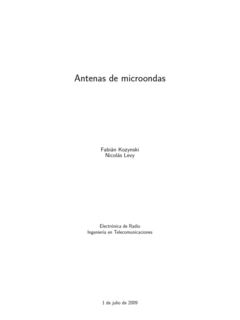 REFERENCIAS Antenas para enlace de microondas - [Link] 2006%20MW%[Link] Zamora; Rodr guez; Lpez; Muoz - Antenas de satlites - [Link] o n e trabajos/pracGrupo2/[Link] D. H. Chiloeches - Estudio de la capa f sica - [Link] wireless/[Link] Mobile Phones Spares - [Link] htm Gonzlez; Alonso; Prez - Diseo de antenas PIFA utilizando los algoritmos genticos a e n e [Link] ursi2000/trabajos/[Link] P. Wade - The W1GHZ Online Microwave Antenna Book - [Link] n1bwt/[Link] Wikipedia - Radar - [Link] Wikipedia - Phased array - [Link] Wikipedia - Microwave - [Link] Wikipedia - Radio Astronomy - [Link] Wikipedia - Very Large Array - [Link] Wikipedia - Numerical Electromagnetic Code (NEC) - [Link] wiki/NumericalElectromagneticsCode NRAO VLA - [Link] 4NEC2 - [Link] Biquad Analysis - [Link] Proveedor Andrew R - [Link]
