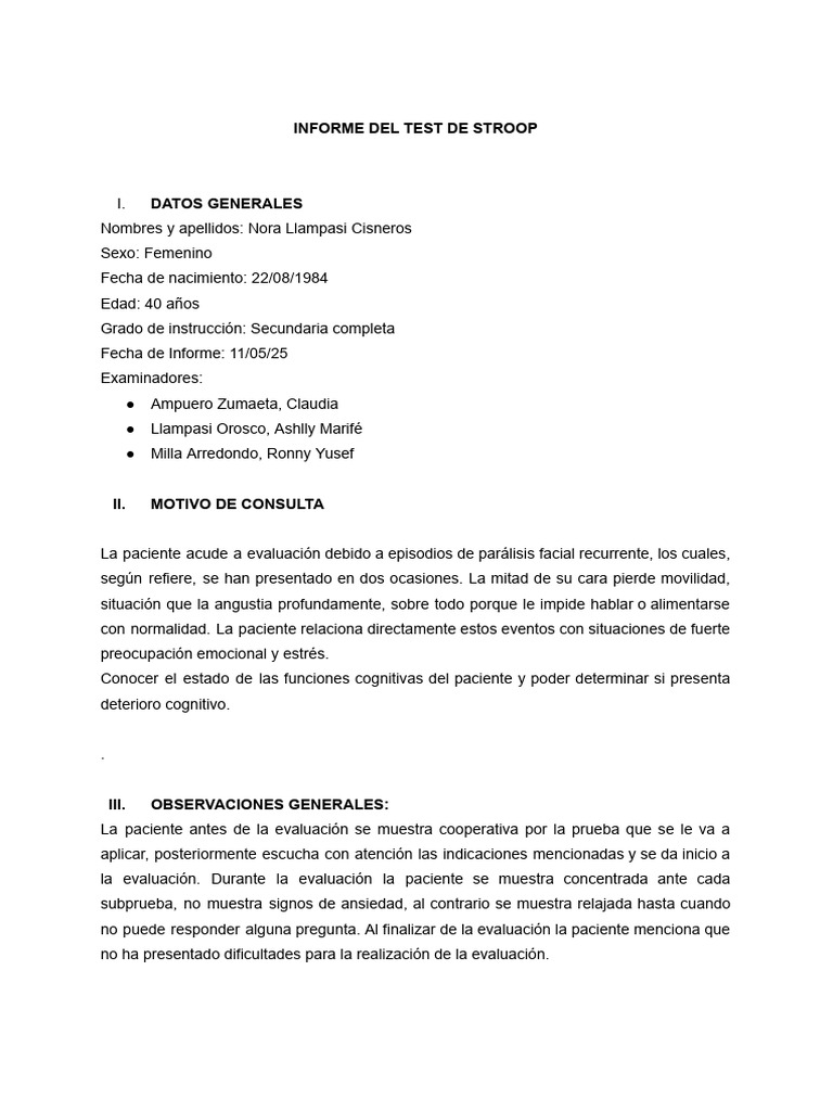 La evaluada en el Test de Stroop obtuvo una puntuación directa de 80 en la tarea de