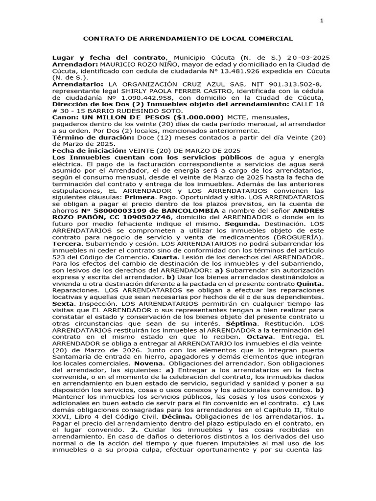 ROZO PABÓN, CC 1090502746, domicilio del ARRENDADOR o donde en lo