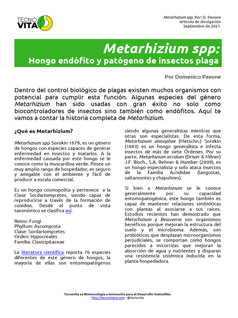 Es un hongo cosmopolita y pertenece a la Si bien a Metarhizium se le conoce