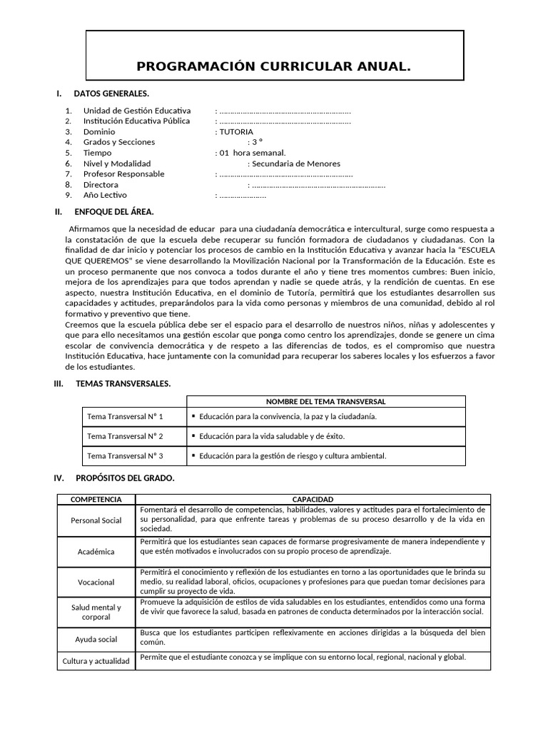 aspecto, nuestra Institución Educativa, en el dominio de Tutoría, permitirá que los estudiantes desarrollen sus