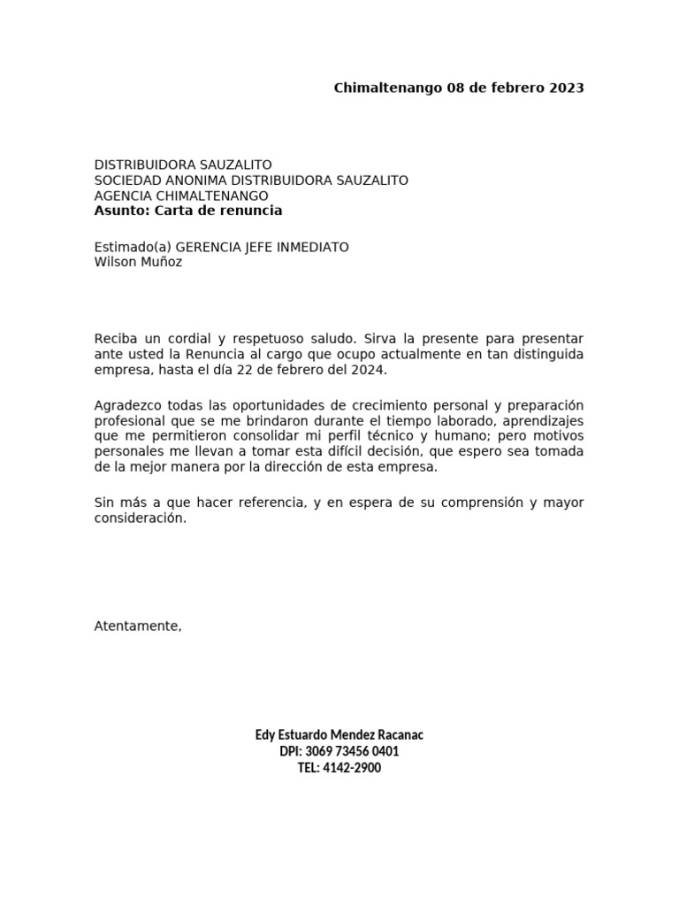 ante usted la Renuncia al cargo que ocupo actualmente en tan distinguida