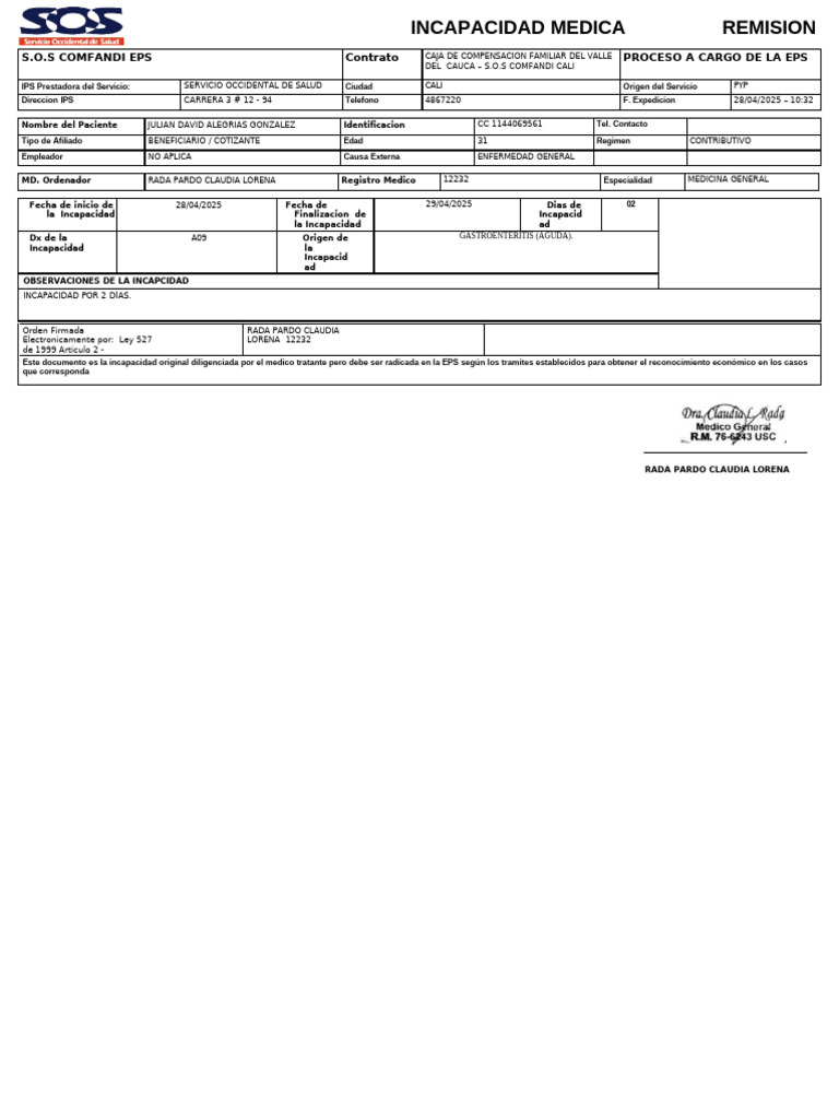 MD. Ordenador RADA PARDO CLAUDIA LORENA Registro Medico 12232 Especialidad MEDICINA GENERAL
