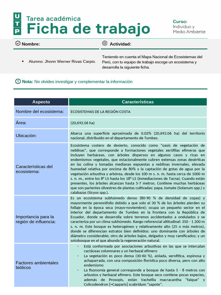 Alumno: Jhonn Werner Rivas Carpio. Perú, con tu equipo de trabajo escoge un ecosistema y