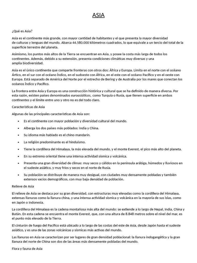 Algunas de las principales características de Asia son: