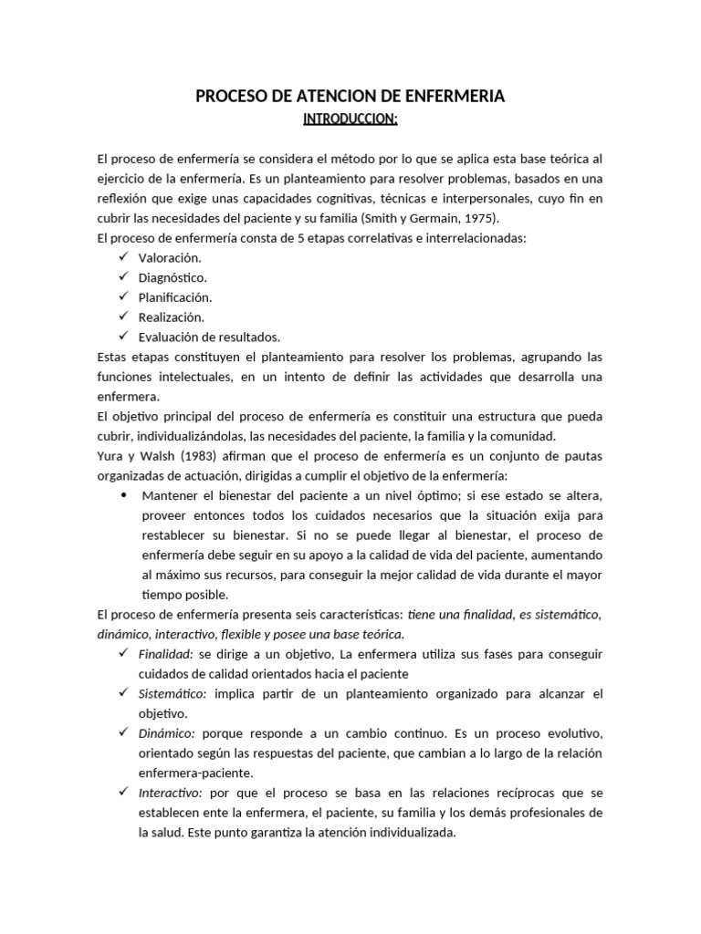 Yura y Walsh (1983) afirman que el proceso de enfermería es un conjunto de pautas